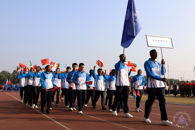 在放飞青春梦想的绿茵操场上,各单位方队及二级学院代表身着统一的服装,喊着响亮的口号走过主席台,接受检阅,展现了各单位特色和朝气蓬勃的青春魅力。国旗护卫队英姿飒爽,迈着雄健的步伐昂首向前,整齐划一的正步体现了量大人饱满的精神。