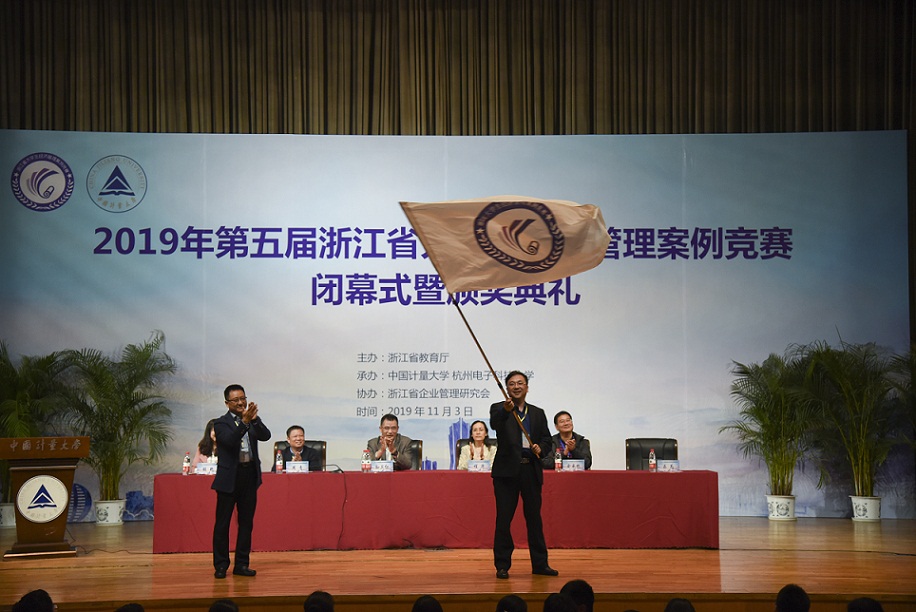 在第五届浙江省大学生经济管理案例竞赛闭幕式暨颁奖典礼上,还举行了浙江省大学生经济管理案例竞赛会旗交接仪式,我校经管学院院长乐为将会旗交到了承办第六届浙江省大学生经济管理案例竞赛的浙江万里学院的代表手中。