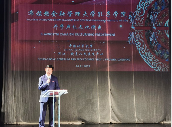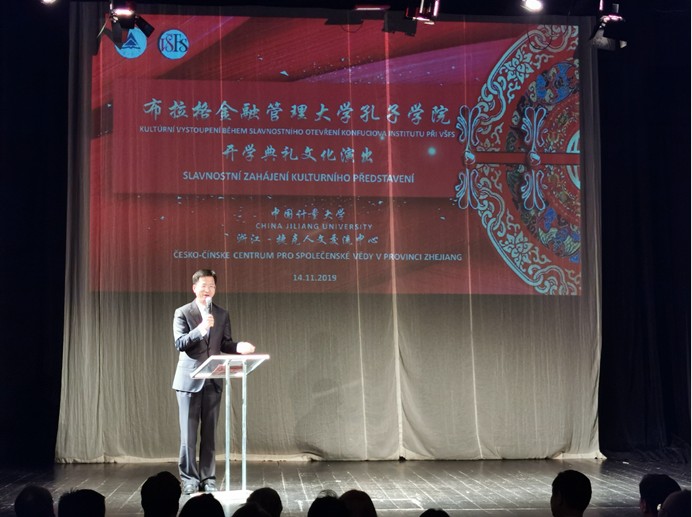 2019年11月14日,我校在布拉格市中心Mana Divadlo歌剧院隆重举行浙江-捷克人文交流中心暨布拉格金融管理大学孔子学院开学典礼文化演出活动。中国驻捷克大使张建敏、中国驻捷克大使馆教育组负责人赵长涛、我校校长宋明顺、布拉格金融管理大学校长波沪斯拉娃·申基洛娃、捷中友好合作协会执行副会长彼得·莫哈雷克等嘉宾,欧洲华捷发展有限公司董事长张凤德等捷克浙资企业代表和布拉格金融管理大学师生等170余人观看文化演出活动。