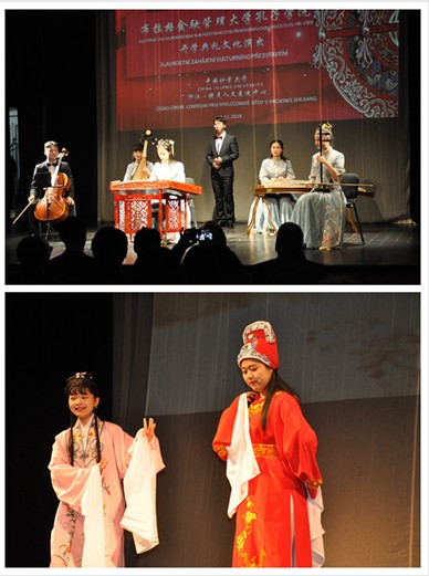 在文化演出活动中,来自我校器乐团、均钟合唱团的同学和武术队的老师们为与会嘉宾带来了民族乐器演奏《采茶舞曲》、越剧《天上掉下个林妹妹》、琵琶独奏《杨春白雪》、合唱《山居秋暝》和中华武术表演等赏心悦目的传统文化节目;同时,演出团师生还精心编排了二胡、大提琴演奏捷克著名作曲家德沃夏克的《念故乡》、《幽默曲》,朗诵捷克著名诗人卡雷尔·希内克·马哈的作品《五月》,合唱捷克童谣《哦,儿子,儿子》和中文版捷克名曲《伏尔塔瓦河》。当这些捷克人耳熟能详的节目在歌剧院响起时,演员们收获了雷鸣般的掌声。