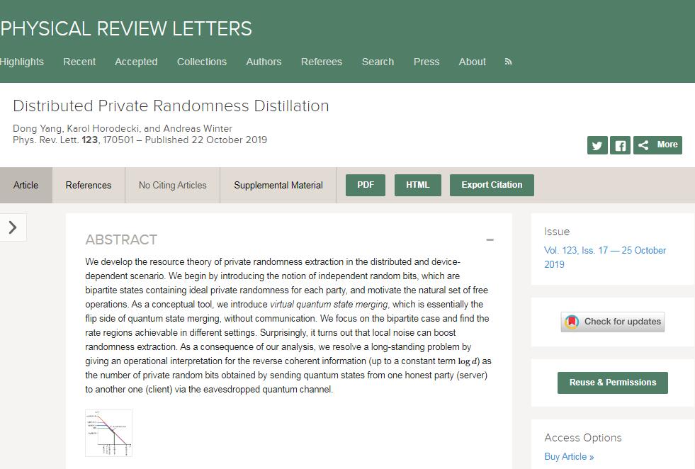 在2019年10月25日出版的物理学国际顶尖期刊《物理评论快报》(Physical Review Letters)上,发表了题为“Distributed Private Randomness Distillation”的研究论文[ Phys. Rev. Lett. 123, 170501(2019)]。该文章的第一作者和通讯作者为我校量子信息实验室杨东研究员,文章是他与波兰格但斯克大学K. Horodecki教授、西班牙巴塞罗那自治大学A. Winter教授合作撰写。