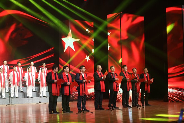 在校领导们的带领下,全场随着《没有共产党就没有新中国》的歌声打着节拍,气氛热烈,掌声满满,将晚会推向高潮。