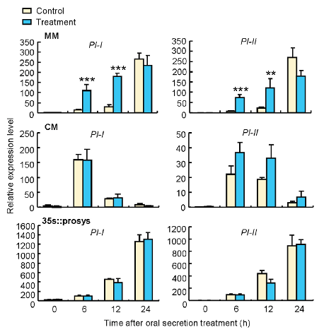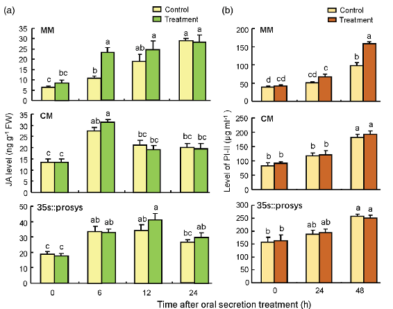 甜菜夜蛾是世界性害虫。近几年,在北京、上海、山东等地都曾出现过上千亩大白菜、大葱和部分番杏及苜蓿遭受虫害,造成绝收的现象。研究人员对MM、CM、35s::prosys三个番茄品种进行了对比分析,结果发现只有MM在应对甜菜夜蛾虫害时,其释放的挥发物能够向邻近番茄预警。
