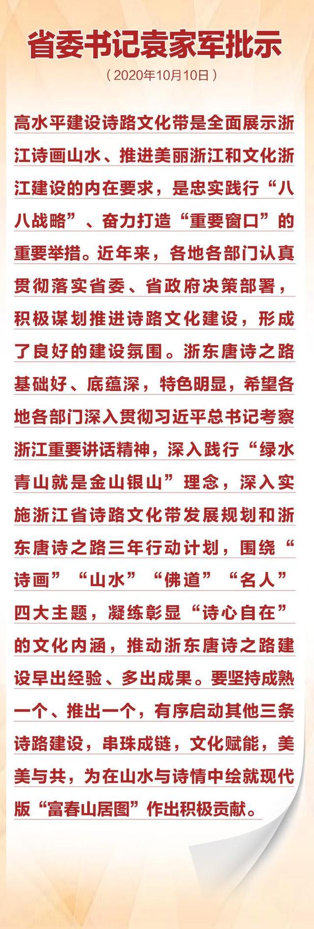 10月12日下午,浙江省诗路文化带建设暨浙东唐诗之路启动大会在天台召开。省委书记袁家军作出批示,省长郑栅洁出席大会并发表讲话。我校副校长葛洪良、人文与外语学院院长邱高兴等出席了大会。邱高兴教授在诗路文化长廊为郑栅洁省长介绍了浙东诗路文化展览的五个部分:序篇,李白的《送王屋山人魏万还王屋》;第一部分悠悠渡口:西兴、鱼浦;第二部分镜湖之歌:柯桥、绍兴;第三部分剡溪风光:嵊州;第四部分梦游天姥吟留别:新昌;第五部分佛宗道源:天台。