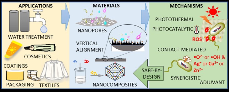 综述总结了抗菌NM在环境和消费产品中潜在应用的最新研究方向,确定了抗菌NMs的主要应用领域以及已在消费产品中使用和正在研究的NMs类型。综述概述了抗菌NM的主要制备方法,包括垂直排列的2D NM涂层表面,具有更大光活化范围的光催化膜,用于太阳光转换的层状纳米复合材料,以及用于控制释放抗菌化合物的金属有机骨架材料。综述还介绍了提高NMs抗菌效率的一些新策略,包括通过2D NMs的边缘进行接触介导的破坏,通过光催化复合NMs有效生成活性氧(ROS),光热破坏以及光催化剂的协同作用和金属离子释放。对于成功进入产品开发阶段的抗菌NM的合成研究,将NM安全评估纳入研发过程的所有步骤非常重要。因此,基于NMs的合成方法和抗菌机制的研究,综述还讨论了抗菌NMs设计安全策略的考虑因素和新型材料的绿色合成途径。本文对在环境和消费品中应用的新型纳米的设计和合成具有重要的借鉴价值。