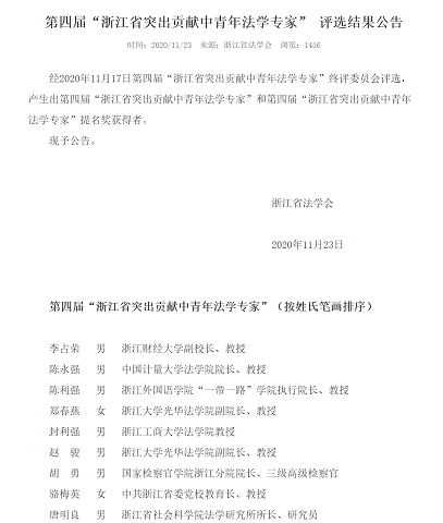 11月23日,浙江省法学会公告第四届“浙江省突出贡献中青年法学专家”评选结果,评选产生“浙江省突出贡献中青年法学专家”10名和 “浙江省突出贡献中青年法学专家”提名奖获得者10名。我校法学院院长陈永强教授荣获第四届“浙江省突出贡献中青年法学专家”称号。