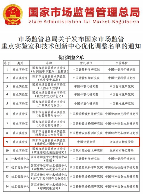 近日,市场监管总局发布了国家市场监管重点实验室和技术创新中心优化调整名单。通过形式审查、专家评审和现场核查等程序,经研究共形成了10个国家市场监管重点实验室和4个国家市场监管技术创新中心。我校光传感与图像我院国家市场监管重点实验室位列其中,是唯一一个以高校为依托单位的实验室。