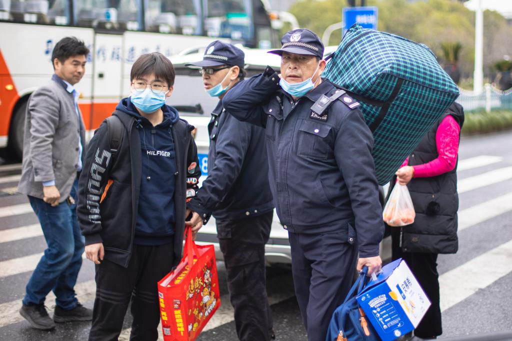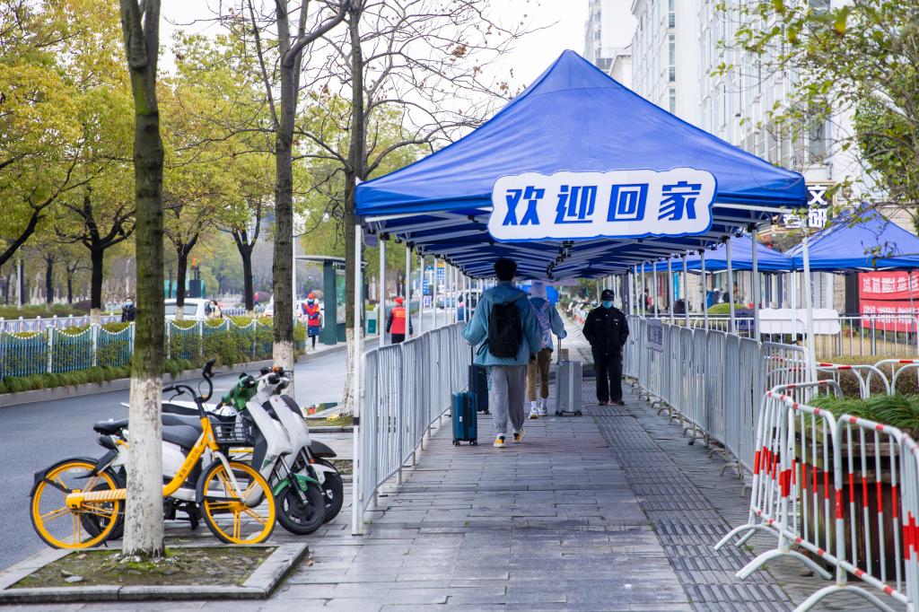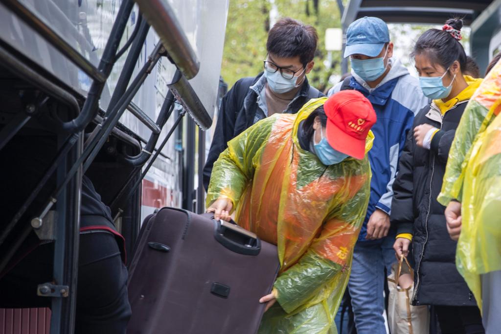 学校在地铁1号线“文泽路”站A口设有校车定点接站服务。教工党员志愿者们身着量大红马甲,扛起学生的大包小包,细致认真地做好一系列志愿服务。生命科学学院19级食品质量与安全专业的舒焕琪来自衢州,中午11:30左右,她在志愿者的指引下顺利坐上了地铁口的接站车返校,“下车时司机师傅还帮忙拿行李了。”