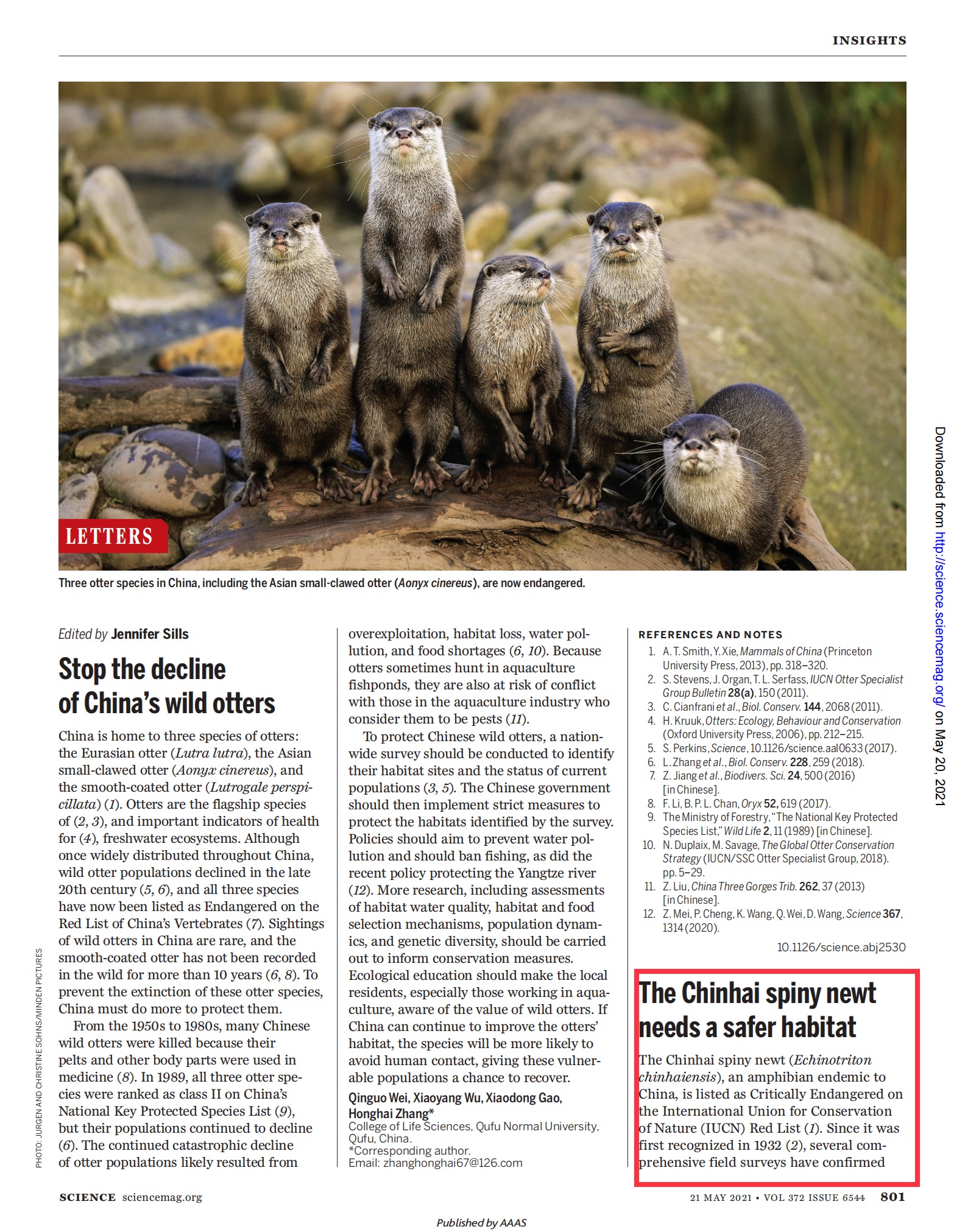 2021年5月21日,我校生命科学学院教师徐爱春博士(第一作者及第一作者单位)、安徽大学和中国科学院动物研究所在《Science》上联合发文(Letter),为极度濒危物种镇海棘螈(Echinotriton chinhaiensis)的保护献计献策。