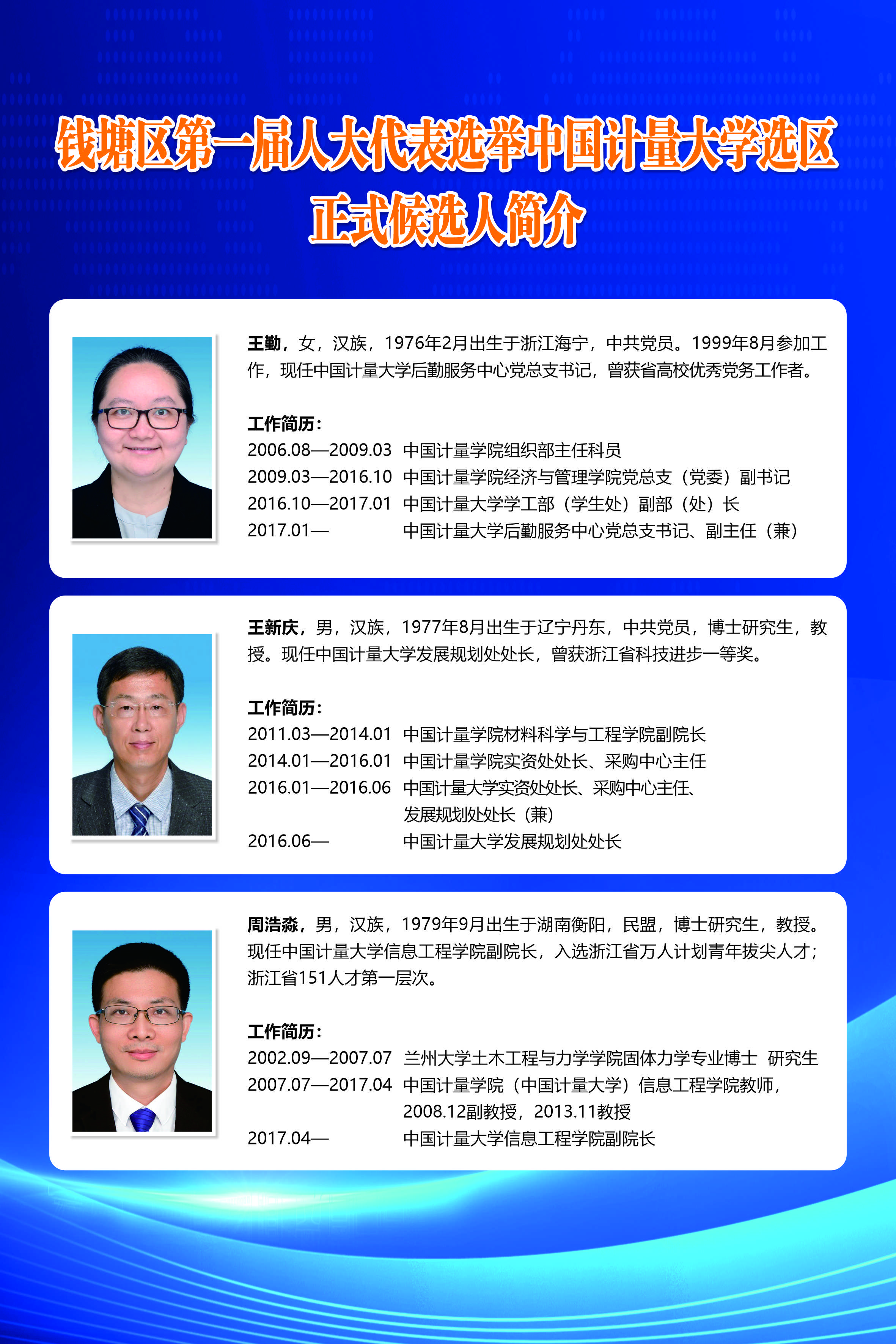 根据白杨街道选举工作领导小组统一安排部署,钱塘区第一届人大代表选举工作即将进入投票阶段。学校经过、推荐、酝酿、讨论和协商等法定程序,后勤服务中心党总支书记王勤、发规处处长王新庆、信息工程学院副院长周浩淼成为钱塘区第一届人大代表选举304am永利集团官网选区正式候选人。5月26日,学校进入选区正式候选人与所在选区选民见面环节,正式候选人和选民在闻厅二楼报告厅面对面,200余名选民代表参加见面会。
