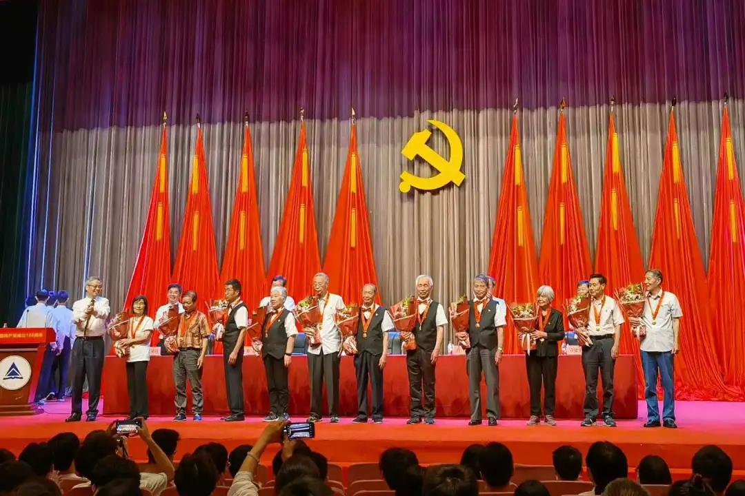 会议对2020年度“学习强国”学习先进集体、学习标兵,校第一届“党建思政专项奖”集体、个人,校“三优一先”组织、个人进行表彰,学校领导依次为受表彰的先进集体和先进个人代表颁奖。张土乔为“光荣在党50年”纪念章获得者代表佩戴纪念章,学生党员代表向他们献花致敬。