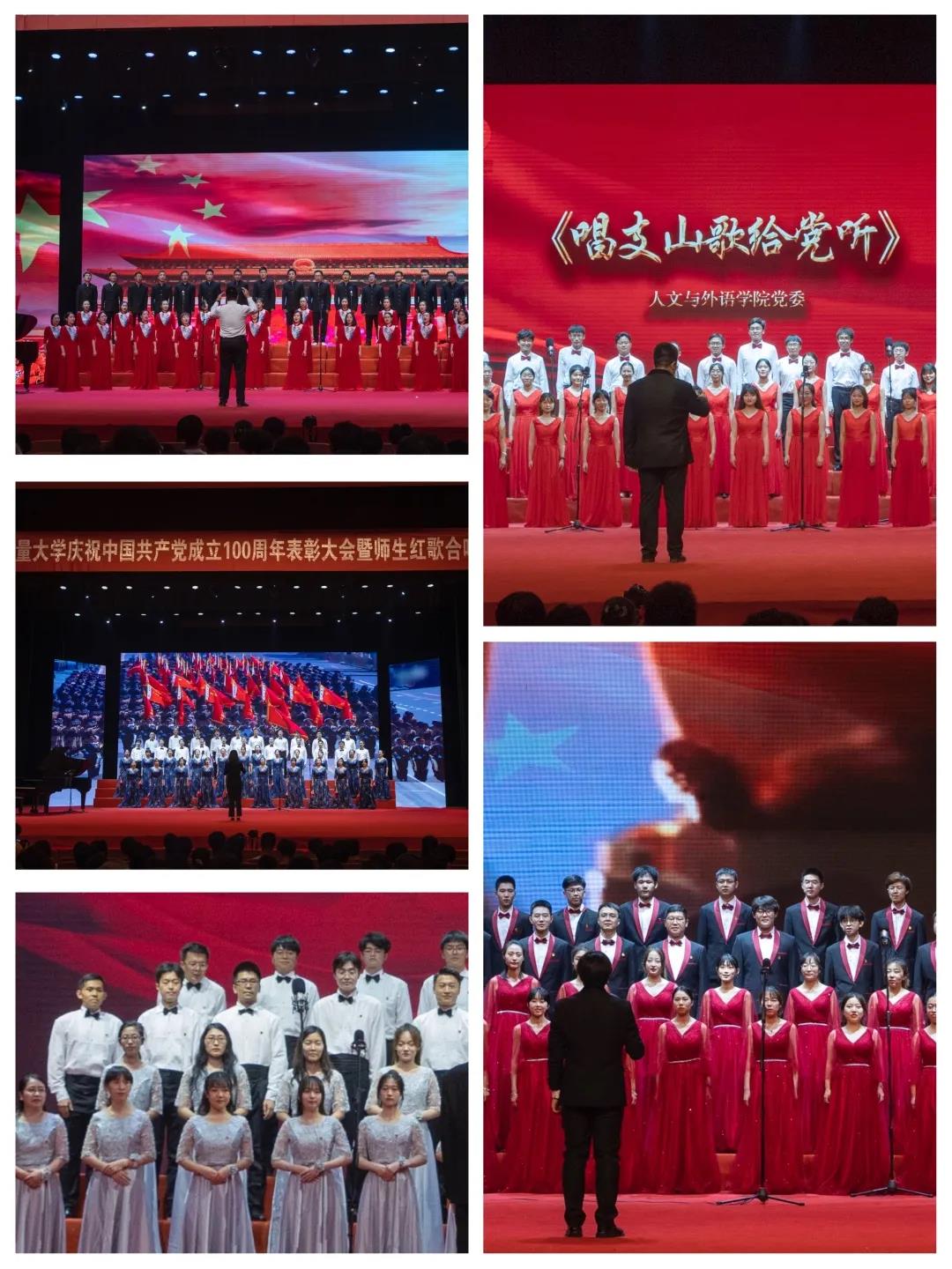 弘扬红色旋律,共唱党的赞歌。师生合唱比赛在全场合唱《没有共产党就没有新中国》的歌声中拉开序幕。《我们走在大路上》《走向复兴》《阳光路上》 《唱支山歌给党听》《在灿烂阳光下》《我爱你中国》《不忘初心》《歌唱祖国》……师生们用优美的歌声热情赞颂党的百年历史和丰功佳绩,真诚抒发自己对党、对祖国、对人民的无限热爱,充分表达不忘初心跟党走的坚定信念。会场内,旋律慷慨激昂,歌声催人奋进,作为特邀演唱曲目,由离退休党委带来的原创歌曲《百年辉煌》以及经典歌曲《革命人永远是年轻》更是将红歌会的气氛推向了高潮。