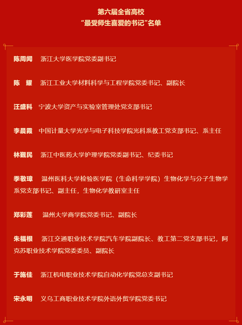 根据全省教育系统庆祝中国共产党成立100周年系列活动和党史学习教育安排,为充分发挥先进典型的示范引领作用,选树一批模范传承红色基因、践行初心使命的高校基层党组织书记,经浙江省教育厅同意,省普通高校党建研究专业委员会、浙江教育报刊总社组织开展了第六届全省高校“最受师生喜爱的书记”选树宣传活动。我校光电学院光科系“双带头人”教工党支部书记李晨霞同志在近百名人选中脱颖而出,荣获第六届全省高校“最受师生喜爱的书记”称号,全省高校仅10名同志入选。全体党支部书记要以“最受师生喜爱的书记”为榜样,深入学习贯彻习近平新时代中国特色社会主义思想,始终不忘为党育人、为国育才的初心和使命,坚决贯彻上级决策部署,不断加强党组织自身建设,持续推动学校党建工作跃迁升级,向党的百年华诞献礼。