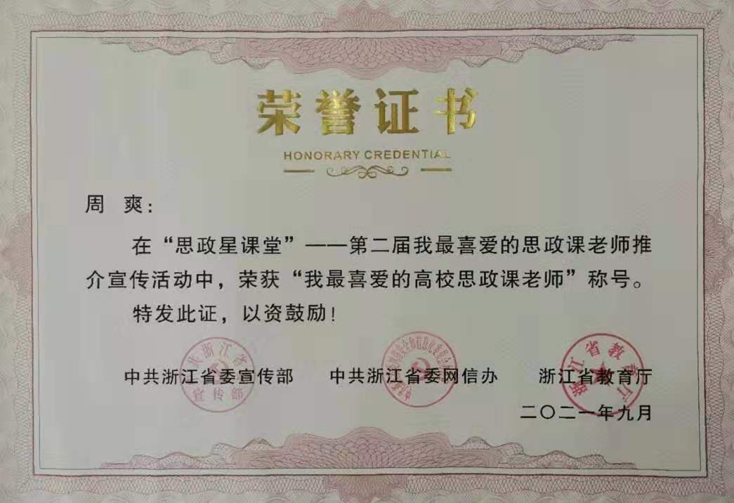 9月30日,由浙江省委宣传部、省委网信办、省教育厅联合主办的“思政星课堂——第二届我最喜爱的思政课老师推介宣传活动”颁奖典礼在杭州师范大学举办。活动得到了广大高校、老师和社会各界的广泛关注,各高校推荐了近百位优秀思政课教师,累计投票数约19万, 吸引了数百万人次关注。最终,活动评选出10名“我最喜爱的高校优秀思政课老师”,还有10位教师被评为“高校优秀思政课老师”。