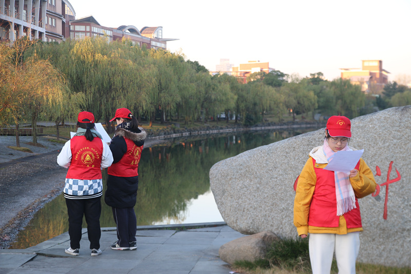 12月2日、3日早上6点30分至7点30分,法学院的志愿者们在日月湖边开展宪法晨读活动。旭日初升,正如学生的精神状态饱满激昂;寒风凛冽,吹不散对宪法的敬畏与尊崇;波光潋滟,恰似宪法在学生心中激起层层波澜。通过这种具有仪式感的宪法晨读活动,让宪法内容与精神深入人心,同时也让路过的师生了解宪法,号召更多的人加入到晨读的队伍中。