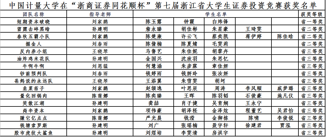 由浙江省大学生科技竞赛委员会主办,浙江财经大学、温州大学、浙江省大学生证券投资竞赛委员会承办,浙商证券股份有限公司、浙江核新同花顺网络信息股份有限公司协办的第七届浙江省“浙商证券同花顺杯”大学生证券投资竞赛日前落下帷幕。我校学生获得省一等奖1项、省二等奖3项、省三等奖12项。