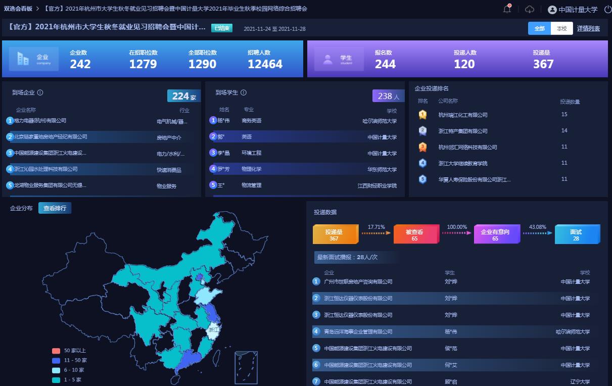 本次网络招聘会共吸引242家用人单位报名参会,提供招聘职位1279个,招聘人数12464个。杭州光学精密机械研究所、中国能源建设集团华东电力试验研究院有限公司、格力电器(杭州)有限公司、新凤鸣集团股份有限公司、华测检测认证集团股份有限公司、浙江九安检测科技有限公司等企业参与招聘。