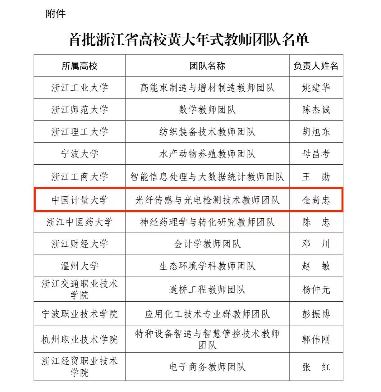近日,浙江省教育厅公布了首批13个浙江省高校黄大年式教师团队名单。我校金尚忠教授领衔的“光纤传感与光电检测技术教师团队”成功入选。