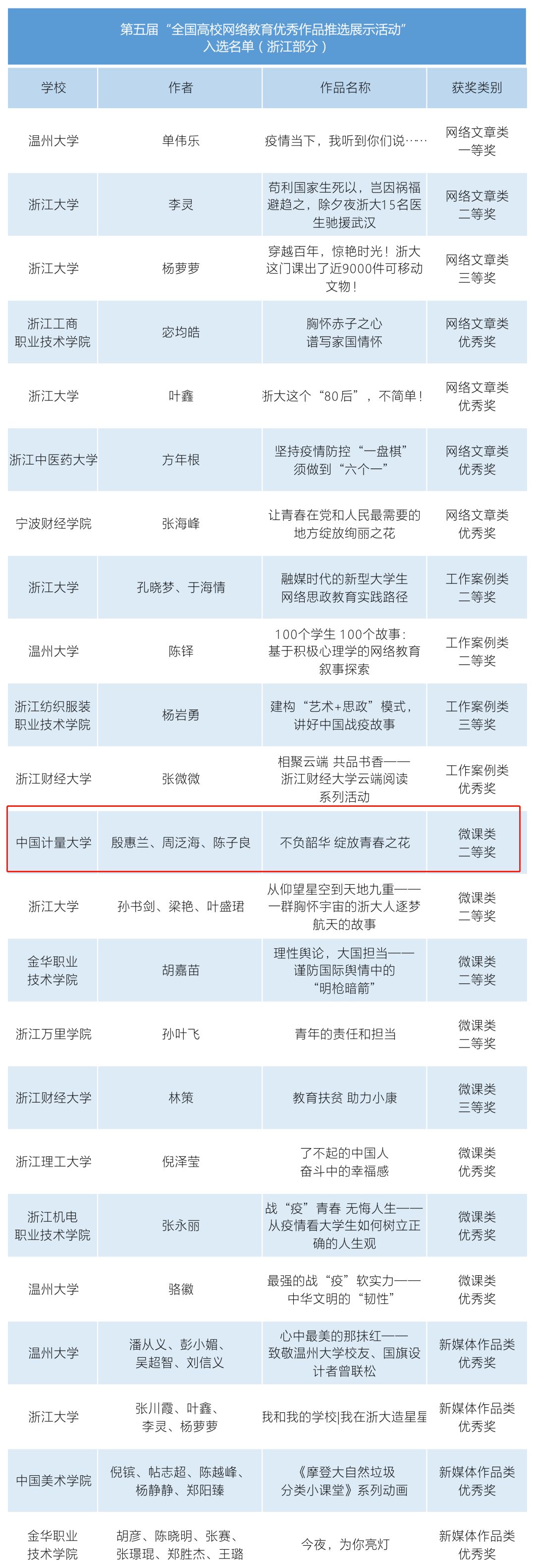 近日,由教育部思想政治工作司、中央网信办网络社会工作局联合主办的第五届“全国大学生网络文化节”和“全国高校网络教育优秀作品推选展示活动”遴选结果公布,我校教师殷惠兰、周泛海、陈子良创作的微课作品《不负韶华 绽放青春之花》荣获第五届全国高校网络教育优秀作品推选展示活动二等奖。