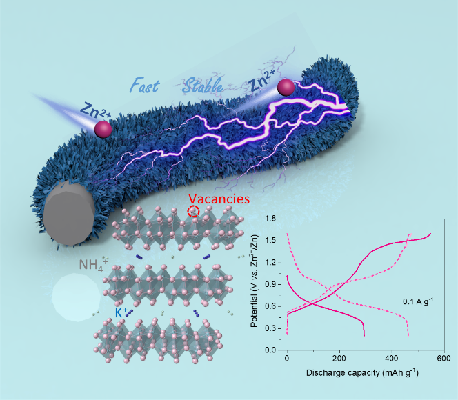水系锌离子电池由于其具有高比容量、低成本、高安全性和环境友好等优势,在大规模储能领域有着良好的应用前景。正极材料对电池的性能至关重要,其中,钒基化合物由于其元素价态多、层状结构高度可调等特征表现出极大的竞争力。但是,钒基化合物低的本征电导率和缓慢的反应动力学仍然制约着它们的进一步发展。尽管在钒氧层中预插入离子、分子或高分子可以提高材料的电导率和反应动力学,但是预嵌离子通常会降低钒元素的价态,造成容量损失。因此,将层间工程和缺陷工程相结合可以进一步促进电极材料的反应动力学,提升比容量和循环寿命。