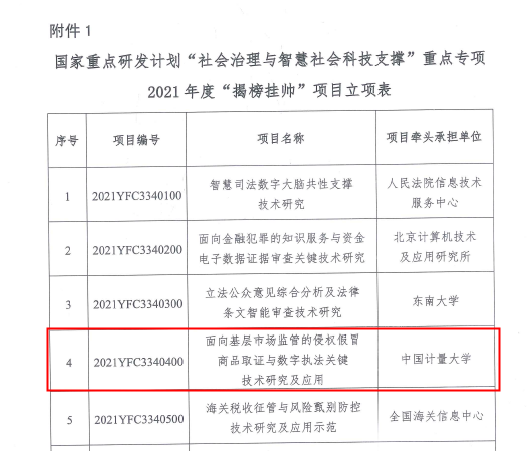 近期,国家重点研发计划“社会治理与智慧社会科技支撑”重点专项2021年度“揭榜挂帅”项目正式下达立项通知,由我校牵头、王乐教授担任项目负责人揭榜申请的《面向基层市场监管的侵权假冒商品取证与数字执法关键技术研究及应用》(项目编号:2021YFC3340400)获批立项。项目总经费3600万,其中中央财政经费1800万,研究周期三年,是学校“十四五”以来首个获批的国家重点研发计划“揭榜挂帅”项目。