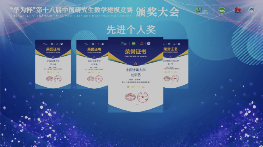 在2021年第十八届中国研究生数学建模竞赛上,我校99支研究生队伍代表学校参赛,再一次实现全国一等奖“满额获奖”,共有3支队伍获全国一等奖,45支队伍获全国二等奖,24支队伍获全国三等奖,所获成绩较往年有较大提升。获奖率在所有参赛高校中排名全国第2,达74.5%,总成绩在参赛的459所高校(研究生培养单位)中排名全国第19,这是我校首次跻身全国前20名。学校连续三年获得优秀组织奖,刘学艺老师获第十八届中国研究生数学建模竞赛”先进个人”荣誉称号。