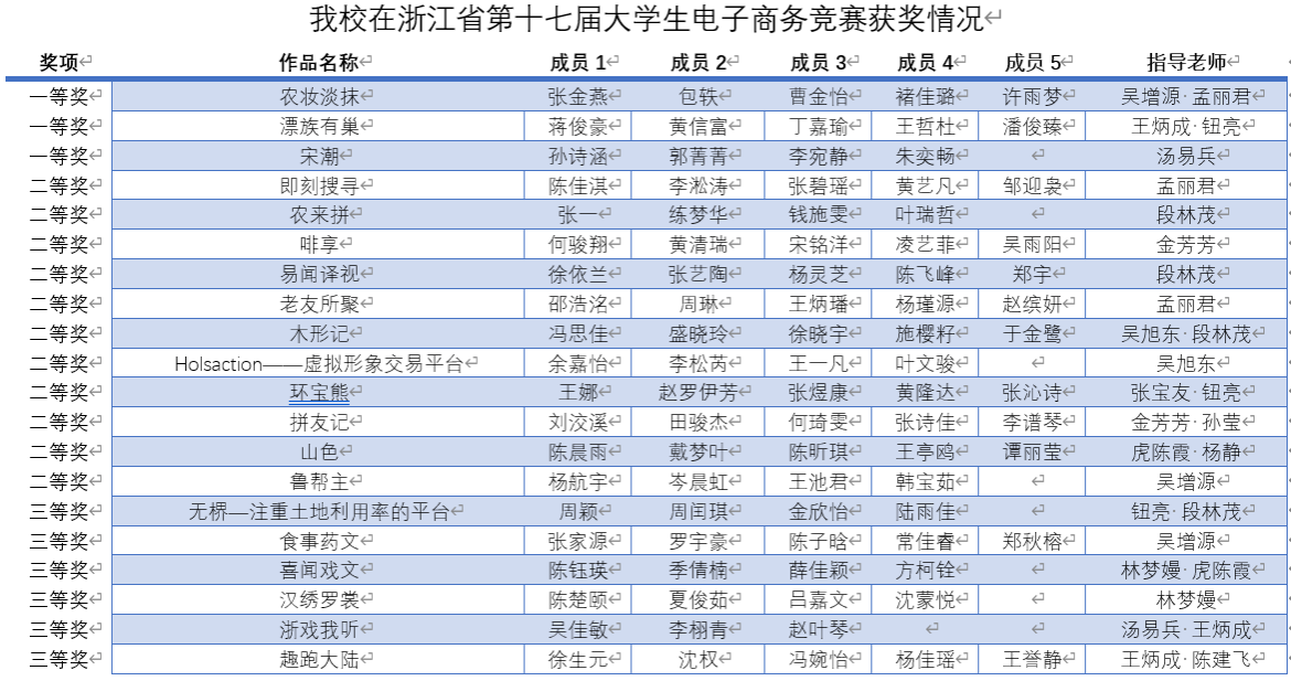 浙江省第十七届大学生电子商务竞赛暨第十二届全国大学生电子商务“创新、创意及创业”挑战赛充分展现了浙江省浓厚的电子商务发展氛围、浙江省高校一流的电商竞赛水平以及参赛师生们的智慧。通过专家评审,从省内86所高校的1163个作品中遴选出271个优秀作品进入决赛。再经过紧张激烈的角逐,最终决出省级一等奖93项,二等奖178项,三等奖290项。