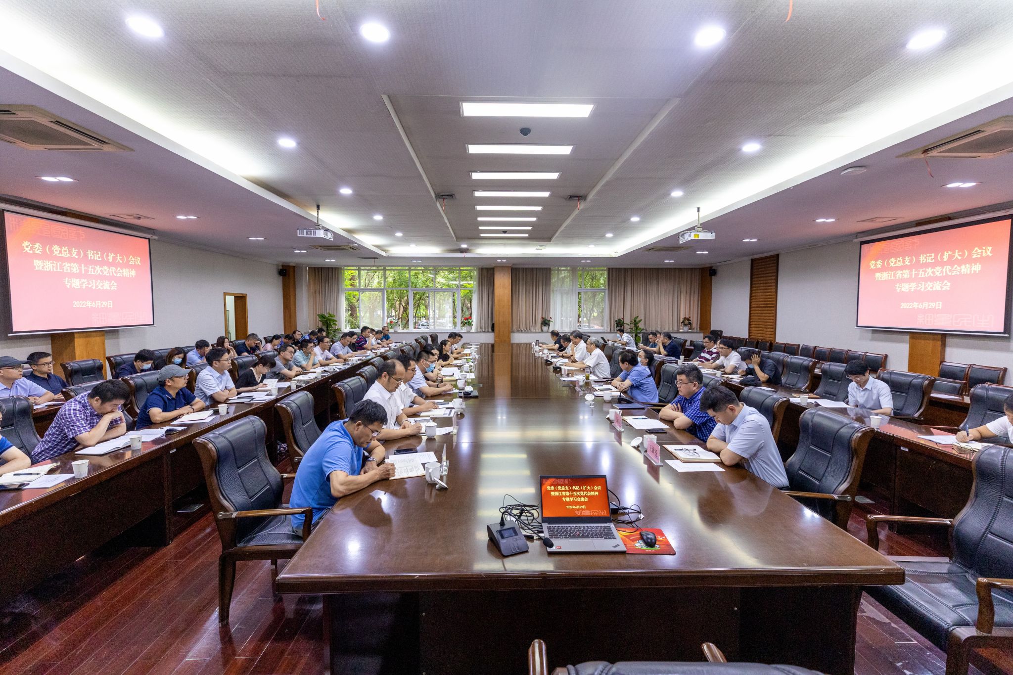 校党委书记张土乔结合作为党代表参会的切身经历谈学习体会并作总结讲话。张土乔指出,省第十五次党代会是在我省迈入高水平全面建设社会主义现代化、高质量发展建设共同富裕示范区新征程的历史节点上召开的一次重要会议,大会取得了丰硕的政治成果、理论成果、组织成果和战略成果,进一步凝聚了感恩总书记、奋进新征程的高度政治共识,增强了坚决拥护“两个确立”、坚决做到“两个维护”的高度政治自觉;系统深入学习了习近平新时代中国特色社会主义思想和习近平总书记关于浙江工作的重要指示精神,明确了推进中国特色社会主义共同富裕先行和省域现代化先行的思想指引和行动指南;科学擘画了未来五年浙江发展的宏伟蓝图,明确了战略方向、战略目标、战略任务,标注了浙江新的历史方位和奋斗坐标。认真学习宣传贯彻省第十五次党代会精神,是全校上下当前和今后一个时期的重要政治任务,全校党员干部要充分认识省第十五次党代会的重要意义,深刻理解和准确把握省党代会的精神实质,切实学深悟透省党代会精神,增强推进“两个先行”的政治自觉、思想自觉、行动自觉。