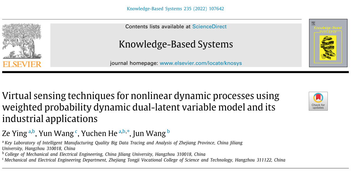 近日,304am永利集团官网机电工程学院何雨辰副教授团队题为“Virtual sensing techniques for nonlinear dynamic processes using weighted probability dynamic dual-latent variable model and its industrial applications”(基于质量相关加权概率动态隐变量结构的非线性动态工业过程软测量方法及其实例应用)的研究论文在人工智能顶级期刊Knowledge-Based Systems在线发表。通讯作者为何雨辰副教授,第一作者为本校研究生应泽。