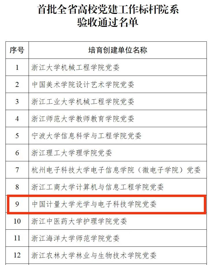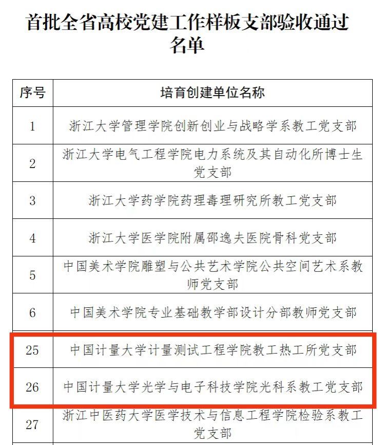 10月17日,中共浙江省委教育工作委员会办公室印发《关于公布首批全省高校党建工作示范高校、标杆院系、样板支部培育创建单位验收通过名单的通知》,我校省党建工作标杆院系光学与电子科技学院党委、样板支部我院测试工程学院教工热工所党支部和光学与电子科技学院光科系教工党支部,经对标自查总结、专家审查复核和公示,由浙江省委教育工委认定通过验收。