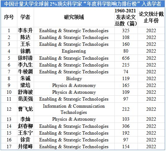17位学者入选全球前2%顶尖科学家“年度科学影响力排行榜”榜单,分别是:李东升、陈达、王乐、徐鹏、徐时清、李九生、牛棱渊、朱诚、梁培、舒海波、范美强、曹飞龙、李灿、赵春柳、王东宁、徐贲、井绪峰。