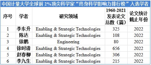 6位学者入选全球前2%顶尖科学家“终身科学影响力排行榜”,分别是:李东升、陈达、徐鹏、徐时清、赵春柳、李九生。