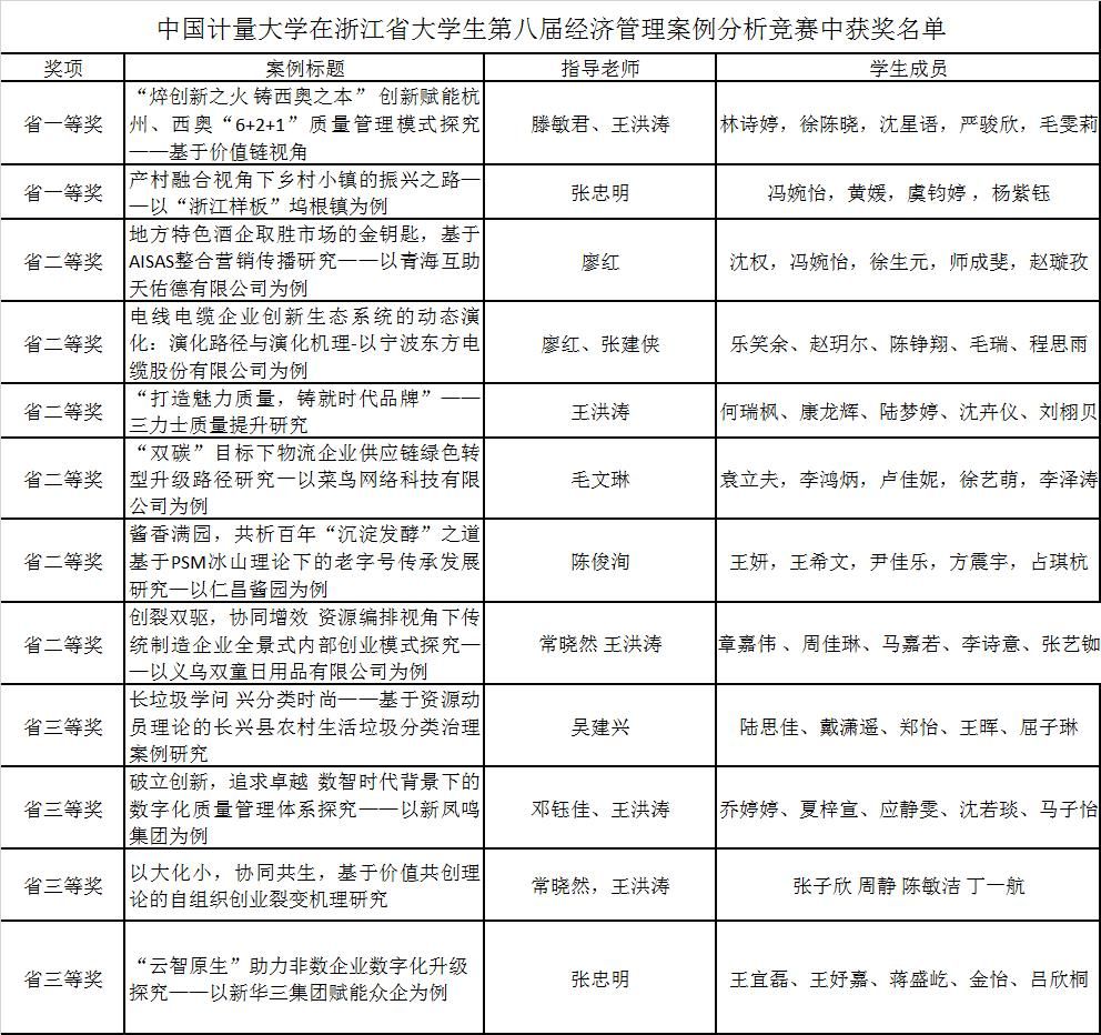 11月13日,由浙江省教育厅主办,杭州电子科技大学、湖州师范学院承办的浙江省大学生第八届经济管理案例分析竞赛落下帷幕,本次竞赛规模大、覆盖面广,共有来自全省74 所高校550支队伍参赛,我校共推荐12支队伍参加,经过初赛筛选、决赛答辩,我校共荣获2项一等奖,6项二等奖,4项三等奖,获竞赛组织奖;本次经济管理案例分析竞赛我校获奖率达100%,获奖率取得历史性突破。