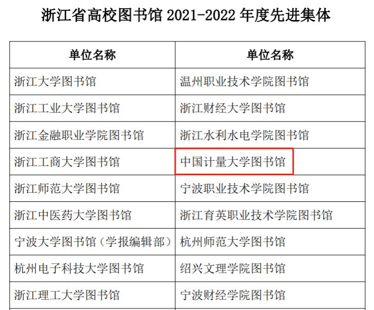 近日,浙江省高等学校图书情报工作委员会发布了《关于公布浙江省高校图书馆2021—2022年度先进集体、优秀馆长及先进个人的通知》,我校图书馆被评为“浙江省高校图书馆2021-2022年度先进集体”,这项荣誉是我校全体图书馆人努力拼搏、团结协作的结果,既是对我校图书馆过去工作的认可和肯定,也是对我们以更高的标准干在实处、走在前列、再创新功的鼓舞和鞭策。