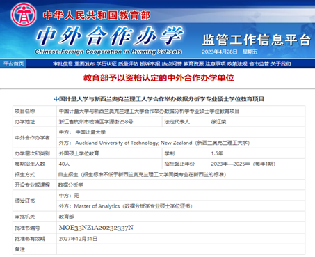 近日,教育部公布了2022年下半年中外合作办学机构和项目的评审结果。我校与新西兰奥克兰理工大学合作举办的数据分析学专业硕士学位教育项目成功获批(批准书编号:MOE33NZ1A20232337N),成为我校首个硕士层次中外合作办学项目。据悉,本次全国共批准了5个硕士项目。