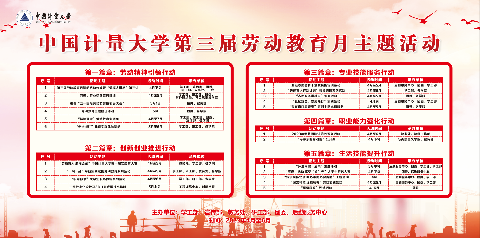 据悉,第三届劳动教育月是学校学习贯彻习近平新时代中国特色社会主义思想主题教育的内容之一,以“学深悟透新思想、铸魂育人担使命”为宗旨,涵盖劳动精神引领、创新创业推进、专业技能服务、职业能力强化、生活技能提升等五项行动,包括劳模大讲坛、“走进浙江”主题实践、“循迹溯源”大调研、志愿服务进社区、“毛泽东的劳动观”公开课、师生同做一道菜等27项活动,将在4月至6月集中开展。