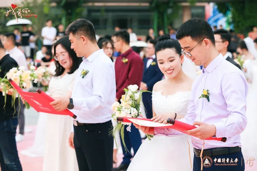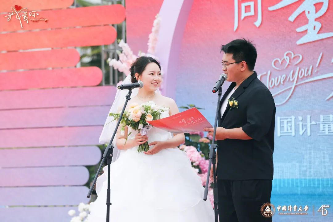 相守到白头的爱情让人羡慕,新婚夫妇的甜蜜互动同样传递出幸福。“我和他是同班同学,刚来到量新学院的时候就认识他了。有一次晚自习我在偷偷抹眼泪,他当时坐我前桌,回头递给我一张纸巾,很小声地说:‘你的眼睛出汗啦,快擦擦!’我立马就被逗笑了。”量新学院2021届毕业生邓卉彤、范金涛作为新人夫妻代表讲述了他们的爱情故事。去年8月他们刚刚结婚,如今,邓卉彤在西湖大学读博,范金涛在浙江工业大学读研,两人偶尔也会再回到下沙,坐着那趟熟悉的3113公交车,来看看量新学院可爱的老师们,抱半个西瓜坐在操场边看学弟学妹们打球跑步,一起回忆青春的大学时光。