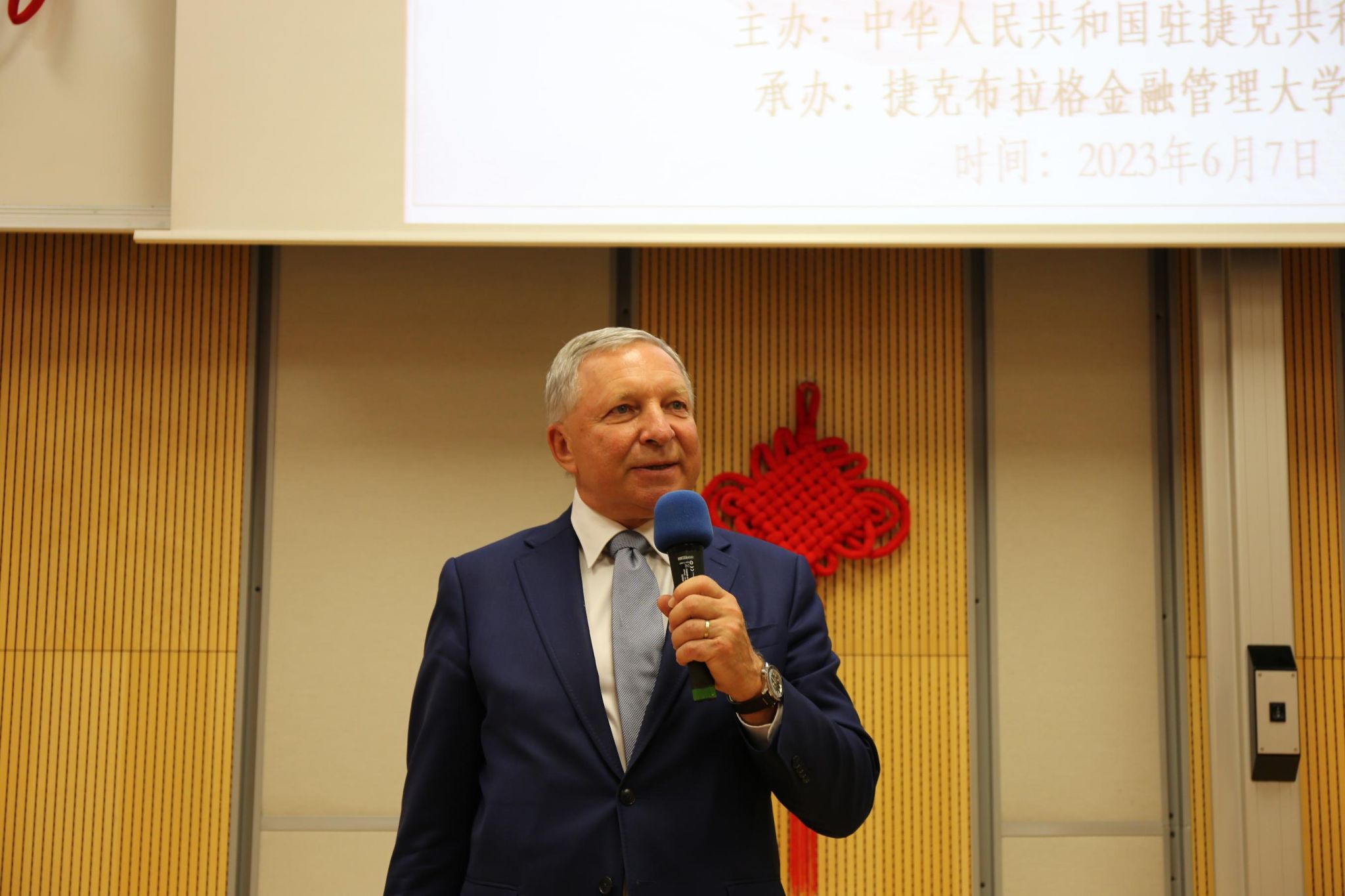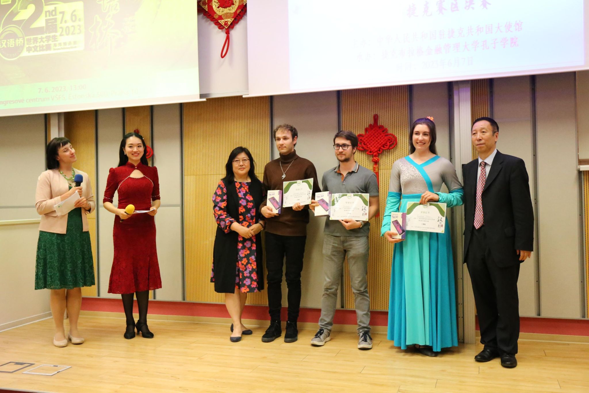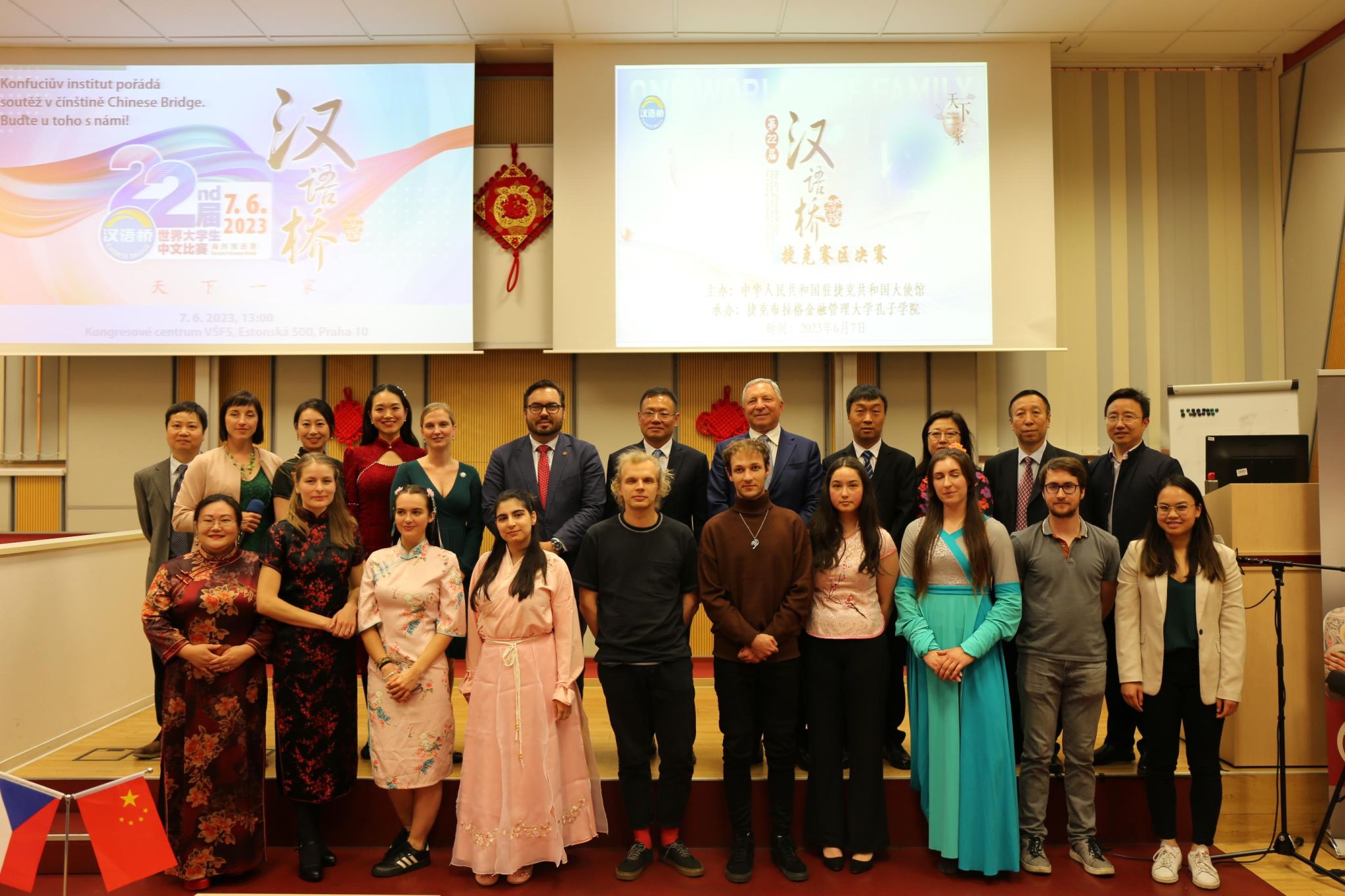 当地时间2023年6月7日,由中国驻捷克大使馆主办、布拉格金融管理大学孔子学院承办的第22届“汉语桥”世界大学生中文比赛捷克赛区决赛在布拉格金融管理大学落下帷幕。中华人民共和国驻捷克共和国大使冯飚、教育事务负责人蒋宇鹏、布拉格金融管理大学董事会副主席Emil Šenkýř、副校长Petr Budinský、国际处处长Lucie Finová等作为大赛嘉宾,布拉格金融大学孔子学院中方院长姜辉、帕拉茨基大学孔子学院中方院长陈忠、布杰约维采商业技术学院孔子课堂中方院长郝文钧、布拉格中华国际学校校长戴波作为大赛评委,布拉格金融管理大学师生以及来自光明日报、中欧文联报、布拉格时报等媒体记者等50余人出席并观摩比赛。比赛由布拉格金融管理大学孔子学院项目负责人Petra Maršálková和文化专员狄小倩主持。