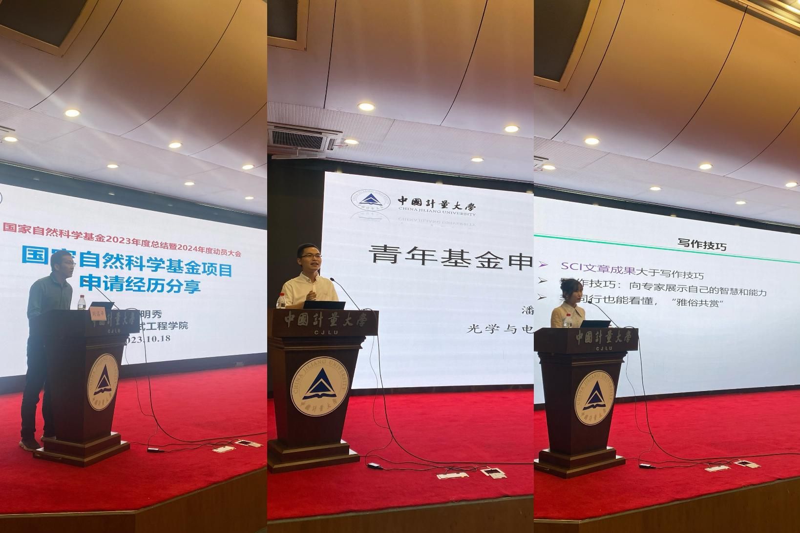 刘洺辛作主题为“国家自然科学基金申请经验分享与交流”的报告。他结合自己多年的科研和项目申报经验,从选题方向、研究内容、研究基础等方面分享了国家自然科学基金申报书撰写技巧,并就研究选题、评审流程等相关问题与青年教师互动。随后,计测学院詹明秀、生科院张爱英、光电学院潘贵明三位青年教师分别就自身的国家自科基金项目申报经验作了分享。