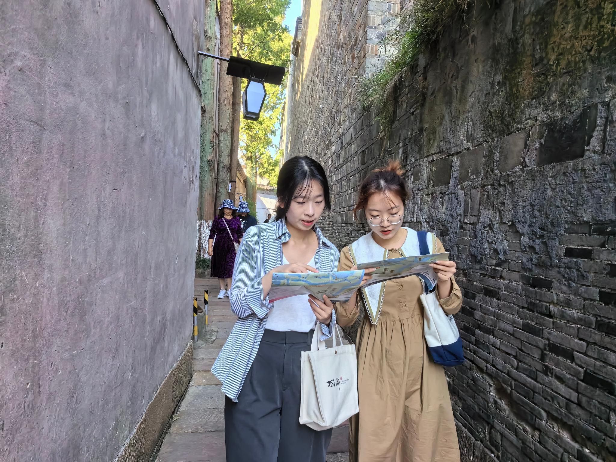 志愿者“小梧桐”周舟的点位在一条充满烟火气的小道里,是望津里站下车的嘉宾们的必经之路。身处美食街区,人流量很大,她不仅要做路线指引,还要为来往的嘉宾提供美食的推荐介绍。当用英文成功引导国际友人品尝乌镇的特色美食,国际友人为她竖起大拇指夸道“So beautiful”时,周舟开心地说:“所有的疲惫都在这一刻被消融了。”