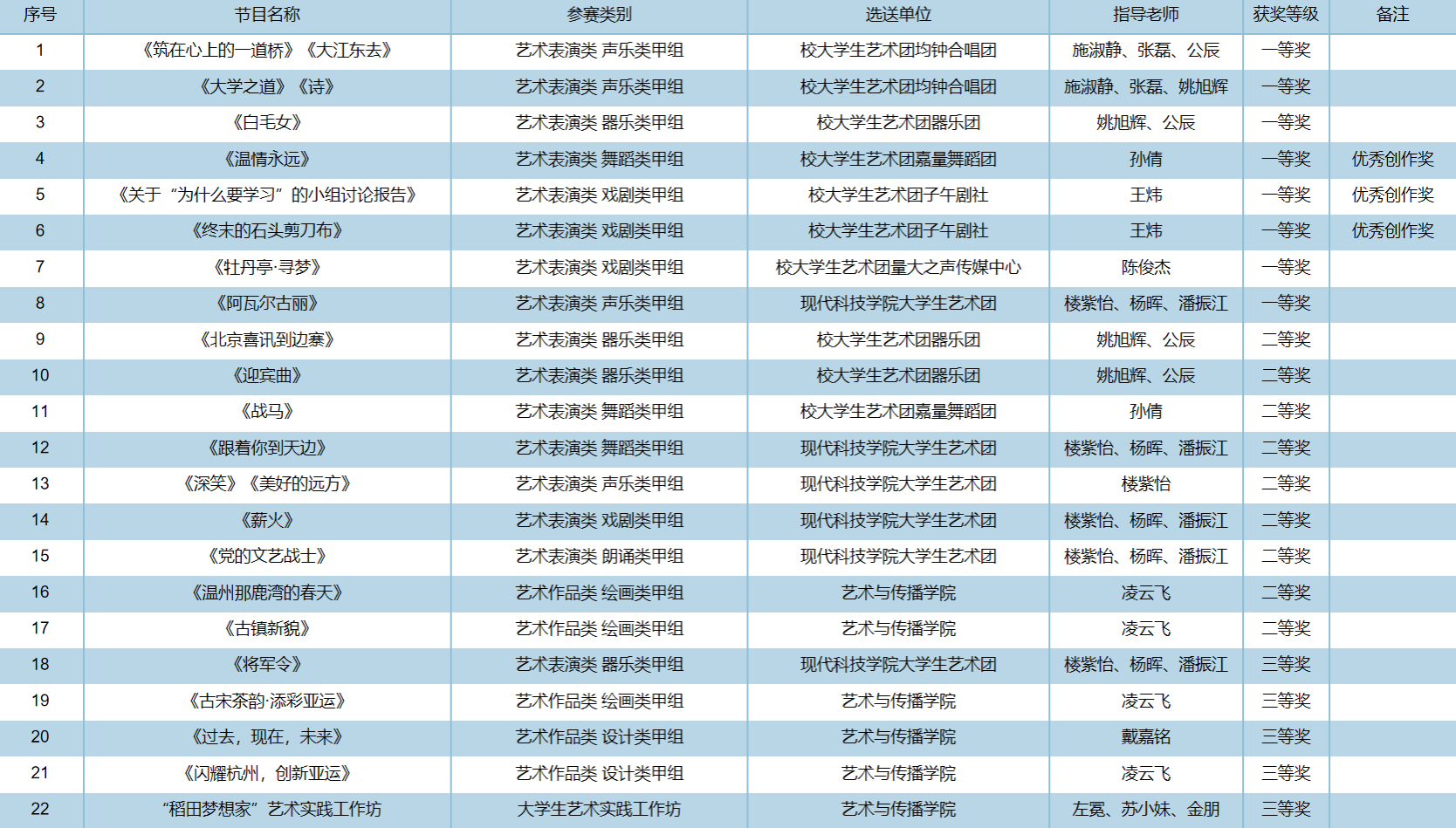 本届省大学生艺术节活动分为艺术表演类、艺术作品类、大学生艺术实践工作坊、高校美育改革创新优秀案例四大类,我校共选送27件作品参加艺术表演类和艺术作品类比赛,1件作品参加大学生艺术实践工作坊比赛,最终斩获一等奖8项,它们分别是:由施淑静老师指导、校大学生艺术团均钟合唱团选送的声乐作品《大学之道》《诗》和《筑在心上的一道桥》《大江东去》,由姚旭辉、公辰老师指导、校大学生艺术团器乐团选送的器乐作品《白毛女》,由孙倩老师指导、校大学生艺术团嘉量舞蹈团选送的舞蹈作品《温情永远》,由王炜老师指导、校大学生艺术团子午剧社选送的戏剧作品《关于“为什么要学习”的小组讨论报告》和《终末的石头剪刀布》,由陈俊杰老师指导、校大学生艺术团量大之声传媒中心选送的戏剧作品《牡丹亭·寻梦》,由楼紫怡、杨晖、潘振江老师指导、现代科技学院大学生艺术团选送的声乐作品《阿瓦尔古丽》。其中,以上所有一等奖作品指导教师均获评优秀指导教师称号,原创舞蹈作品《温情永远》、原创戏剧作品《关于“为什么要学习”的小组讨论报告》和《终末的石头剪刀布》均获优秀创作奖。