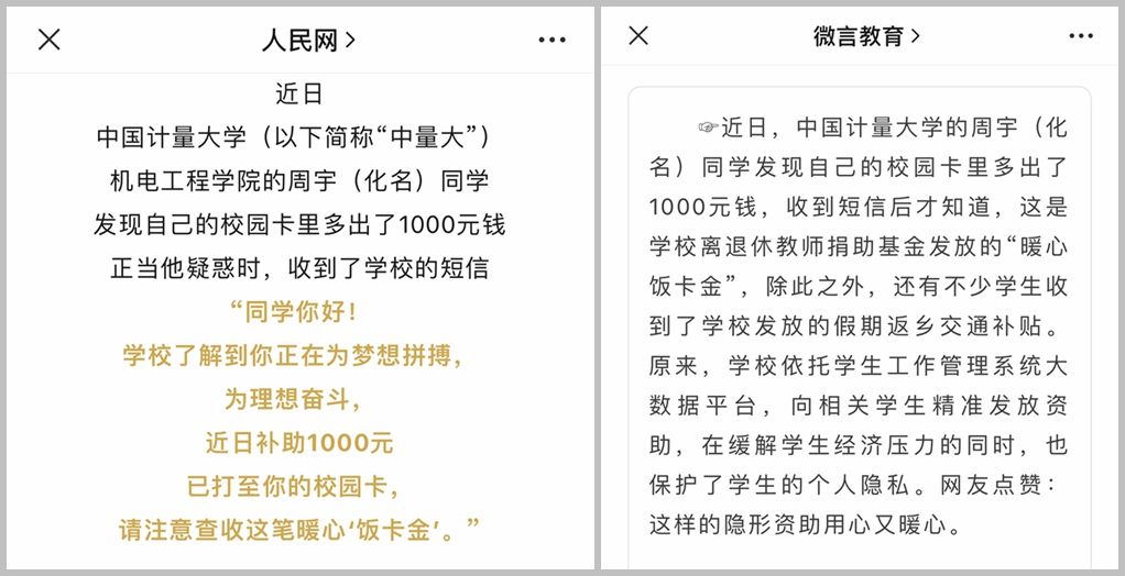 学校始终以学生需求为中心,扎实推进资助育人工作,这一暖心举措受到了人民网、光明日报、中国青年报等多家国家级主流媒体,教育部、团中央等部门政务新媒体的点赞和关注。1月16日,人民网公众号发布《大学生准备期末考,卡里多出1000元?》;1月17日,教育部政务新媒体“微言教育”在《你好,教育早新闻来了(2024.01.17)》一文中点赞我校。在各大留言区收获了众多暖心评论,“‘看不见’的资助,看得见的用心”“总有人在默默守护学生们的柔软心灵!为学校的暖心举措点赞!”“有温度的学校”……