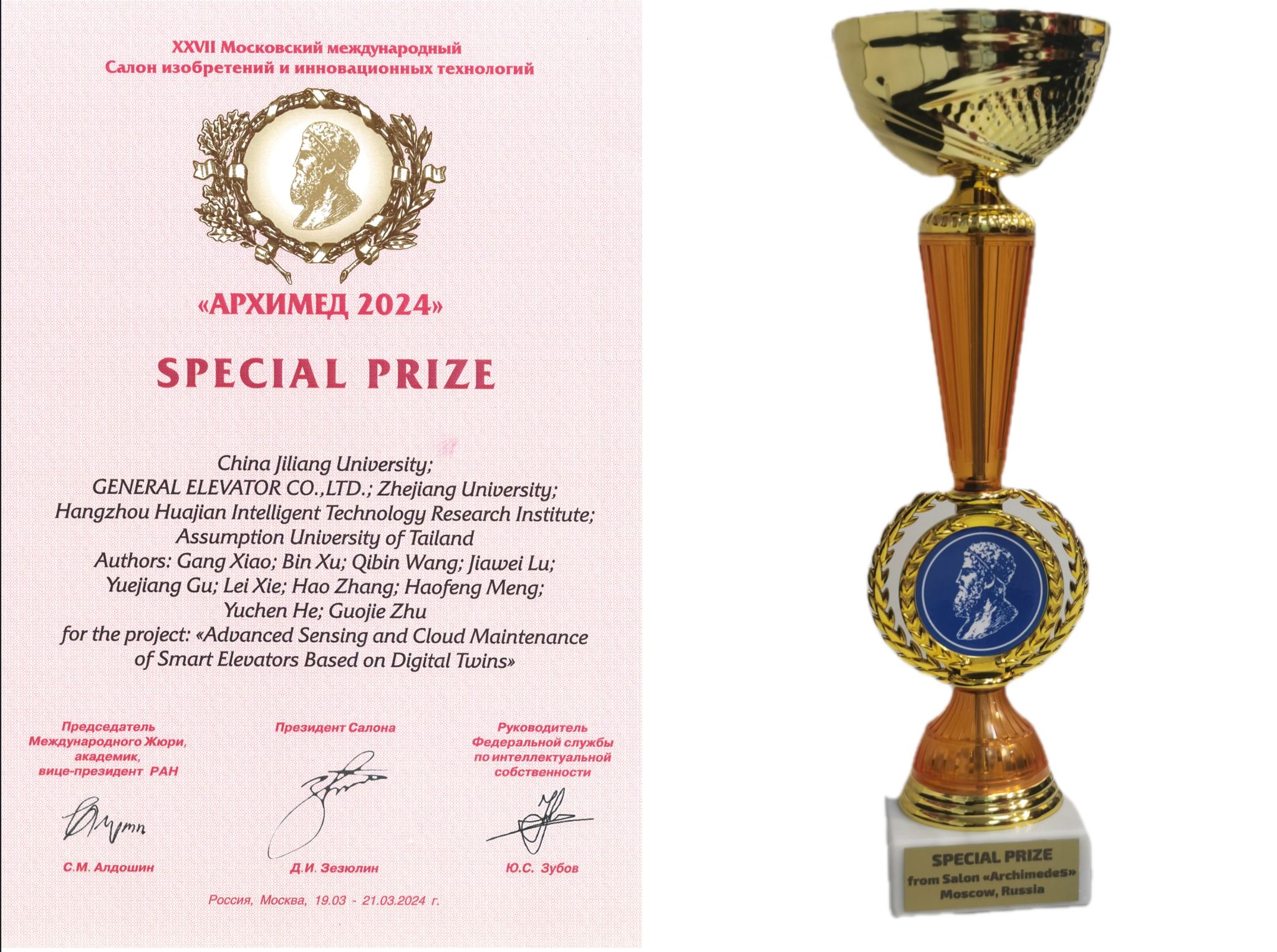 受中国发明协会邀请,我校肖刚教授、陆佳炜副教授等教师共同完成的2项创新成果“基于数字孪生的智能电梯先进感知与云维护关键技术”和“基于轨道交通的特种设备设计制造及测试关键技术”亮相莫斯科第二十七届“阿基米德”国际创新发明展。经过大会专家现场评审,2项成果均获金奖。其中,“基于数字孪生的智能电梯先进感知与云维护关键技术”被进一步评选为“阿基米德”国际创新发明展杰出特别奖。