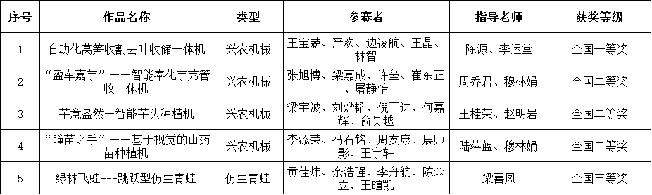 近日,“华中数控杯”第十一届全国大学生机械创新设计大赛在湖北省武汉市华中科技大学举行,经过现场演示、答辩等环节的激烈角逐,由陈源、李运堂老师指导,边凌航、王宝兢、严欢、林智、王晶五位同学合作完成的“自动化莴笋收割去叶收储一体机”作品荣获全国一等奖。同时,学校还获得该项赛事的国家二等奖3项,国家三等奖1项。