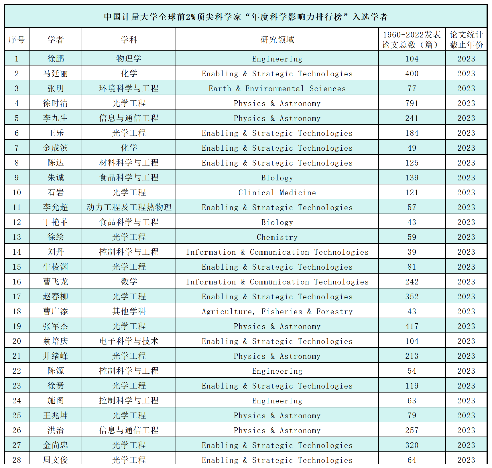 28位学者入选全球前2%顶尖科学家“年度科学影响力排行榜”榜单,分别是物理学学科的徐鹏,化学学科的马廷丽、金成滨,环境科学与工程学科的张明,光学工程学科的徐时清、王乐、石岩、徐绘、牛棱渊、赵春柳、张军杰、井绪峰、徐贲、王兆坤、金尚忠、周文俊,信息与通信工程学科的李九生、洪治,材料科学与工程学科的陈达,食品科学与工程学科的朱诚、丁艳菲,动力工程及工程热物理学科的李允超,控制科学与工程学科的刘丹、陈源、施阁,数学学科的曹飞龙,电子科学与技术学科的蔡培庆和其他学科的曹广添。
