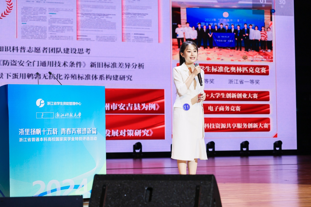 近日,浙江省2024年普通本科高校国家奖学金特别评选大会在浙江科技大学举行。我校推荐的质量与标准化学院2021级本科生张博妍同学凭借其优异的学习成绩、突出的科研能力、丰富的学生工作经历和出色的现场展示,从激烈的竞争中脱颖而出,荣获2024年浙江省本科高校国家奖学金特别奖(全省10名本科生)。