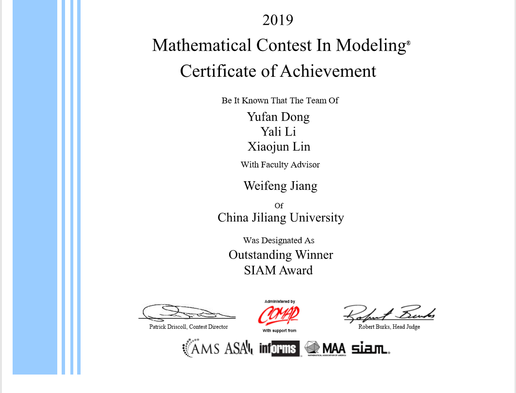 国际大学生数学建模竞赛是数学建模竞赛中级别最高的竞赛,每年吸引国内外众多知名高校竞相参与;比赛从选题到最后提交的论文作品均为全英文,赛题多数也是当前世界上一些研究热点问题,极富挑战;奖项评选也极为严格,先后历时两个多月。