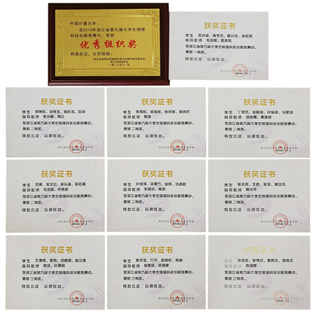 由浙江省大学生科技创新竞赛委员会(浙江省教育厅)、浙江省高等学校物理学类专业教学指导委员会和浙江省物理学会组织的2018浙江省第九届大学生物理科技创新竞赛于11月23日-24日在台州学院进行。本次大赛共有来自省内38所高校参与,参赛作品合计300余项。我校参加决赛10组作品全部获奖,共获得一等奖1项、二等奖6项、三等奖3项的历史最好成绩。同时,由于学校出色的组织工作,获得组委会颁发的“优秀组织奖”。