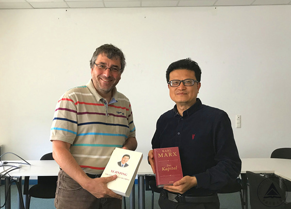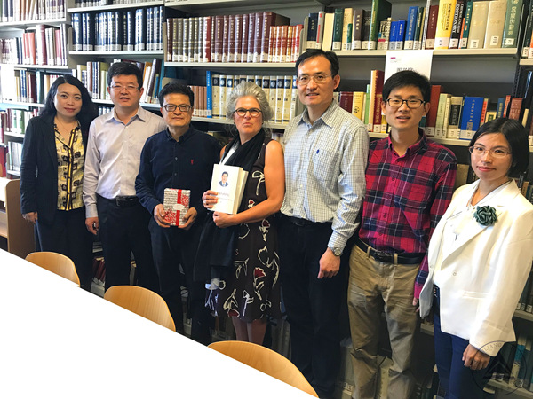 在基尔大学,代表团受到了基尔大学中国中心主任Angelika C. Messner教授的热情接待,并进行了友好交流,她向代表团介绍了基尔大学及中国中心和该校开展马克思主义研究的情况,双方探讨洽谈了师生交流、教育研究等方面的合作意向。代表团向基尔大学赠送了《习近平谈治国理政》,Messner教授回赠了德国原版图书《资本》。代表团参观了基尔大学校园和中国中心图书馆。