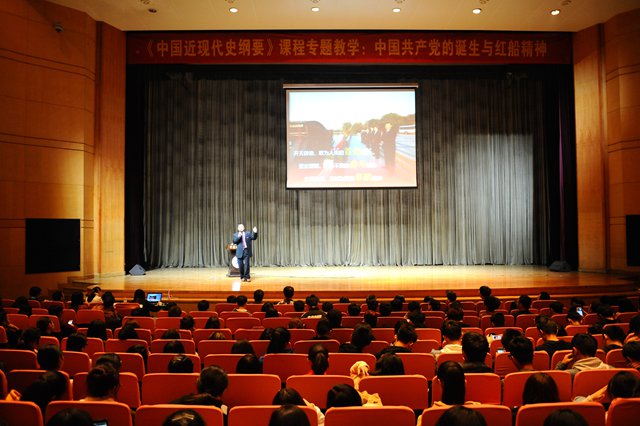 胡建成教授从习近平总书记十九大后参观南湖革命纪念馆导入专题教学,整场专题教学围绕党的建立和红船精神形成的历史必然性,红船精神的内涵,红船精神的历史地位三个问题展开论述。胡建成教授从思想理论基础、实践基础、历史根据、文化条件四个方面分析了党的建立和红船精神形成的历史必然性,指出马克思主义在中国的广泛传播、早期共产党小组的建立、近代中国救亡图存的伟大使命和中国优秀传统文化的传承是党诞生的历史依据。随后重点阐述了“红船精神”的具体内涵,即开天辟地、敢为人先的首创精神,坚定理想、百折不挠的奋斗精神,立党为公、忠诚为民的奉献精神。“红船精神”具有崇高的历史地位,即第一次把实现中华民族伟大复兴建立在科学理论指导的基础上,第一次把实现中华民族的伟大复兴建立在中国共产党领导的基础上,第一次把实现中华民族伟大复兴建立在独立自主地探索中国道路的历史起点上。在讲座中胡建成教授要求同学们认真学习十九大的报告,结合“红船精神”和大学生在学习、生活中遇到问题,鼓励同学们要坚定信念和信仰,确立为人民服务的远大理想,从而超越自我,更好地实现自我价值。胡建成教授史论结合,幽默风趣的精彩的讲授,赢得了同学们阵阵掌声。